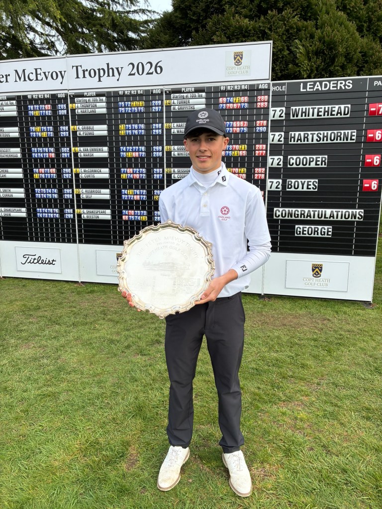 George WHITEHEAD (ENG) won the U18 boys’ McEvoy Trophy by 1-shot with a final round 65, which included a birdie on the 72nd hole, and a 277 (-7) total. Tom HARTSHORNE (ENG), George COOPER (ENG) and Alex BOYES (ENG) all finished on -6 at Copt Heath G.C. to share 2nd place. Results (15-16/04/26)