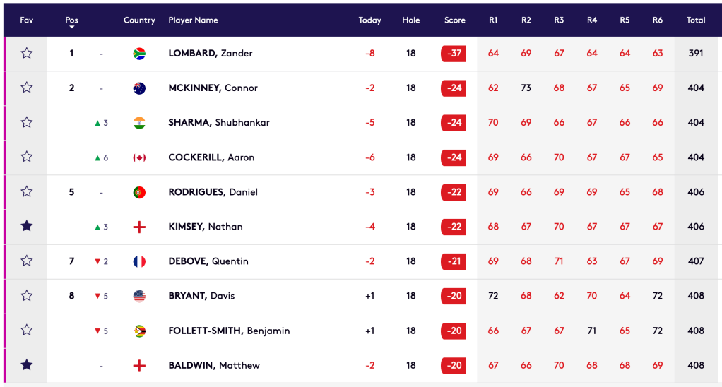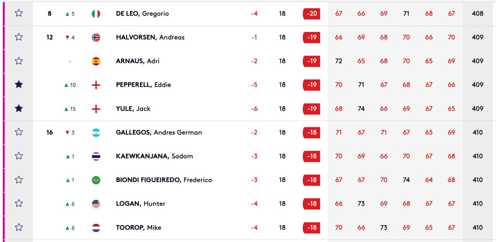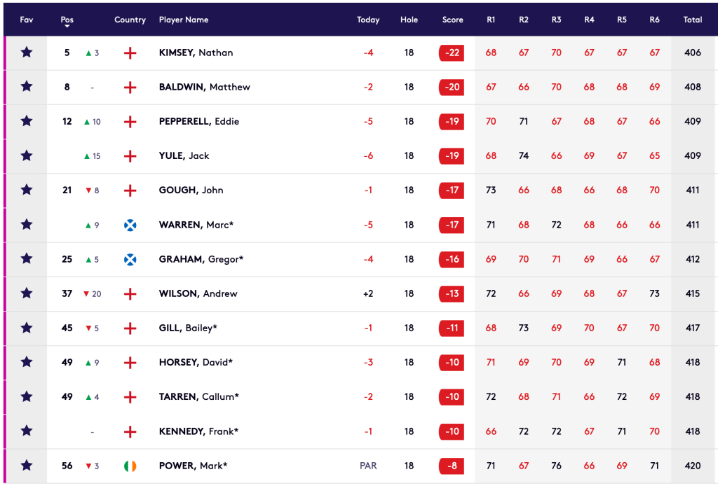 Four GB&I players, Nathan KIMSEY (ENG), -22 tied 5th, Matthew BALDWIN (ENG), -20 tied 8th, and Eddie PEPPERELL (ENG) & Jack YULE (ENG), both -19 tied 12th, were amongst this successful group.