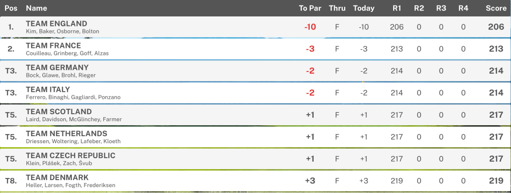 ENGLAND (-10) made a dream start to the 2026 European Nations Championship and after 18 holes enjoy a 7-shot lead.