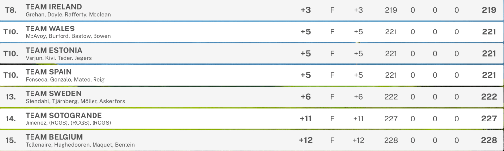 After 36 holes ITALY (-7) are 2nd, FRANCE (-6) 3rd, NETHERLANDS (-5) 4th and CZECH REPUBLIC (-2) 5th at RCG Sotogrande.