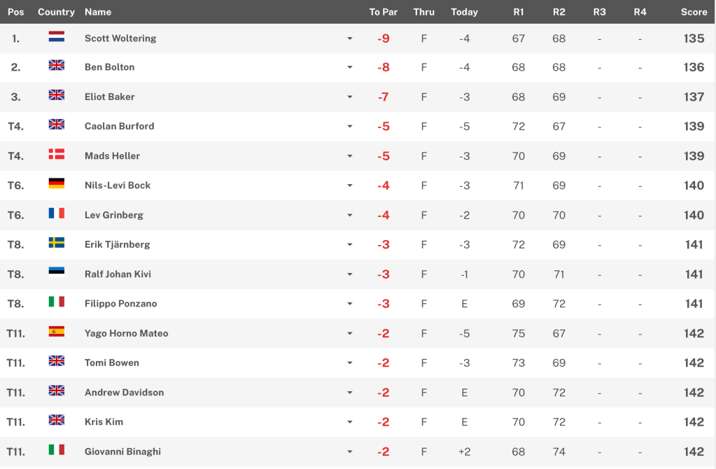 Ben BOLTON (ENG) -8 2nd and Eliot BAKER (ENG) -7 3rd continue to drive the English score.
