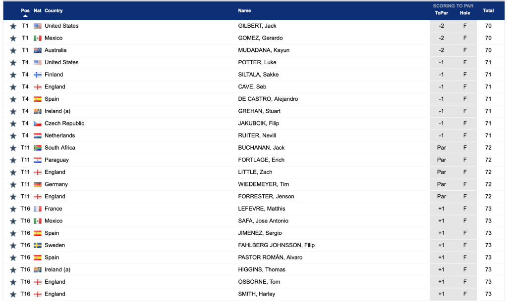 From a GB&I perspective Stuart GREHAN (IRL) -3 is tied 4th, Charlie FORSTER (ENG), Jenson FORRESTER (ENG) & Seb CAVE (ENG) -1 are tied 9th and Eliot BAKER (ENG) & Zach LITTLE (ENG) Ev are tied 18th.