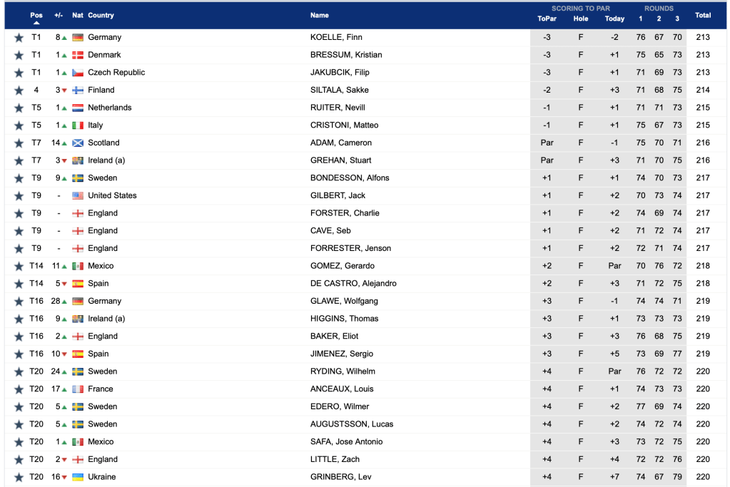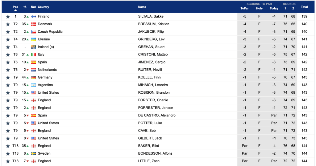 Finn KOELLE (GER), Kristian BRESSUM (DEN) and Filip JAKUBČÍK (CZH) finished Day 2 tied for the lead on 213 (-3). Whilst Bressum and Jakubcik could only manage 1-over 73’s Koelle took advantage with a 2-under 70.