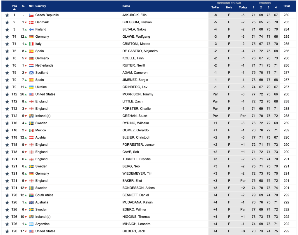 Zach LITTLE (ENG), Charlie FORSTER (ENG) & Stuart GREHAN (IRL) all finished tied 12th on 288 (Ev), Jenson FORRESTER (ENG) & Seb CAVE (ENG) 290 (+2) tied 18th and Freddie TURNELL (ENG) & Eliot BAKER (ENG) 291 (+3) tied 21st.