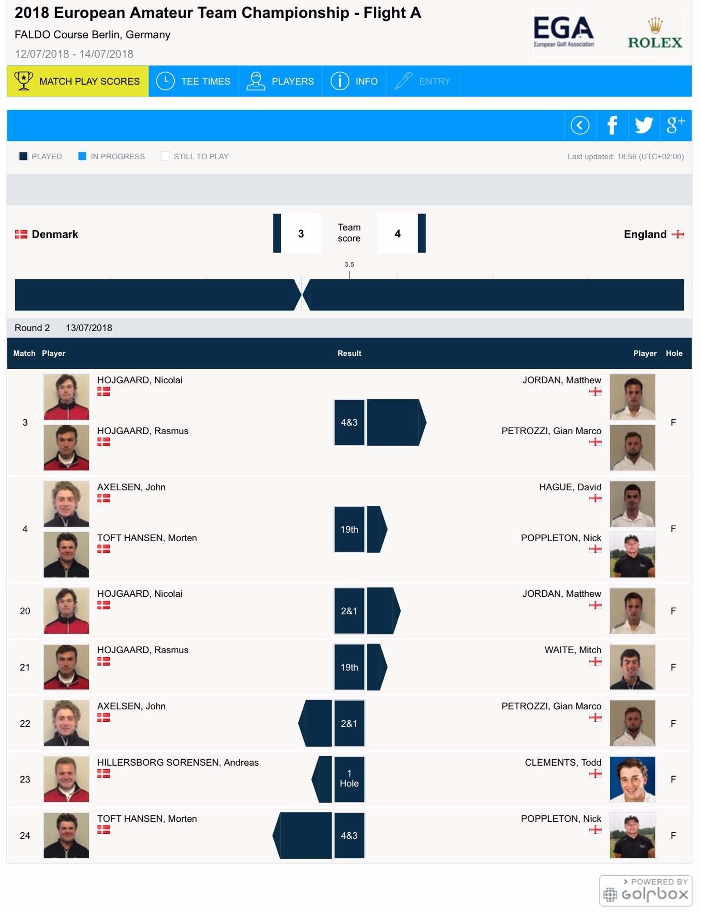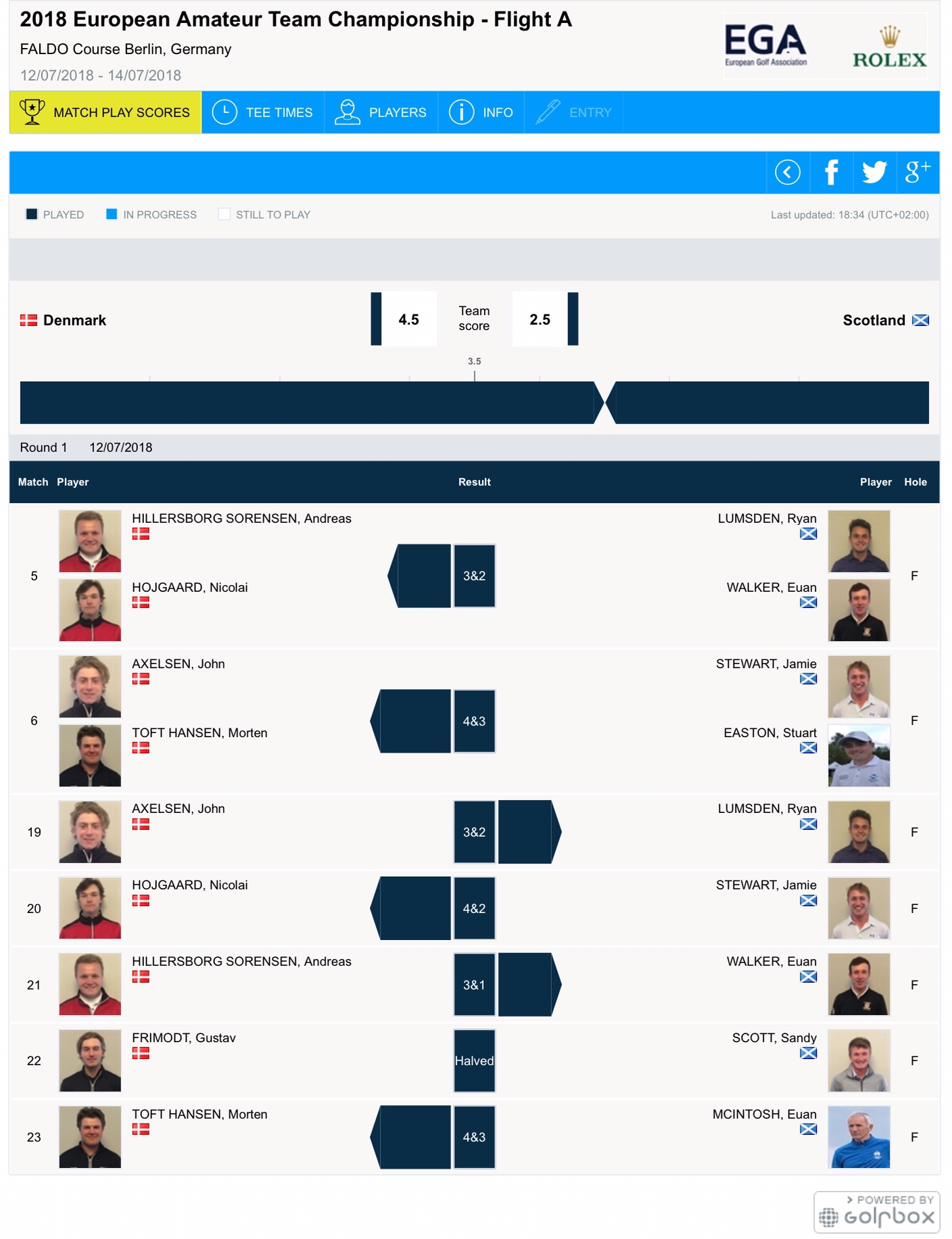 Amongst the pre-tournament favourites SPAIN (-5) 7th, FRANCE (-2) 8th, ESTONIA (-1) 9th and particularly SWEDEN (+5) 14th all have work to do to tomorrow to confirm their places in the Flight A Match Play stage.