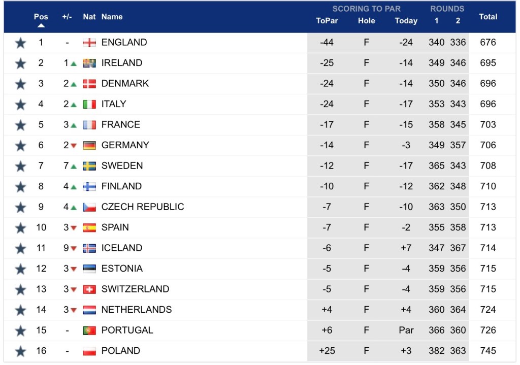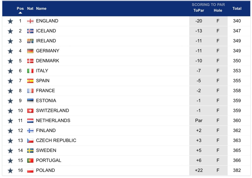 England (-19) finished 5th to qualify for Flight A. Ireland (-11) 9th, Scotland (-10) 10th, who had started the day in 3rd place, and Wales (+3) 14th all missed the match play cut and will now have to play out the week in Flight B.