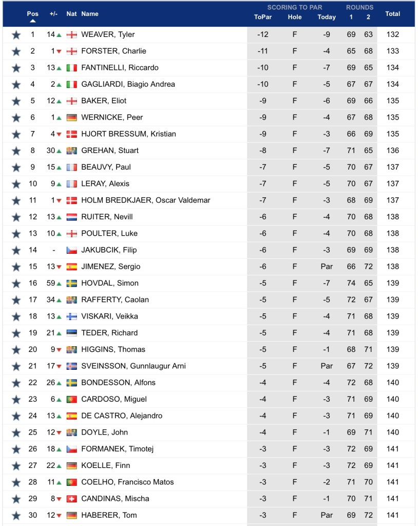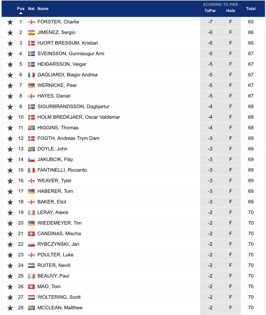 Sergio JIMENEZ (ESP) -6 is 2nd on count back, Kristian HJORT BRESSUM (DEN) -6 3rd, and Icelandic pair Gunnlaugur Arni SVEINSSON and Veiger HEIDARSSON 4th and 5th after they were the best of the five 67’s (-5).
