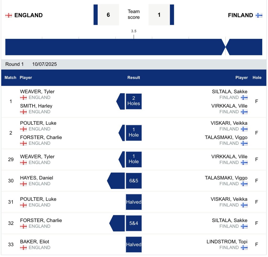 ENGLAND (1) enjoyed a comfortable 6.0-1.0 win against FINLAND (8) in the opening Quarter Final. After winning the two morning foursomes afternoon single wins by Tyler WEAVER, Daniel HAYES and Charlie FORSTER ensured their would be no comeback from the Fins.