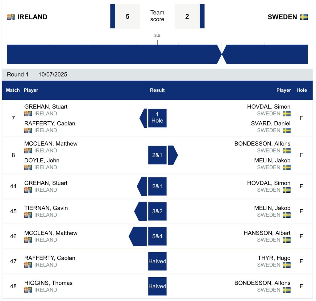Ireland v. Sweden Flight A Quarter Final Results (Graphic: EGA / Golfbox)