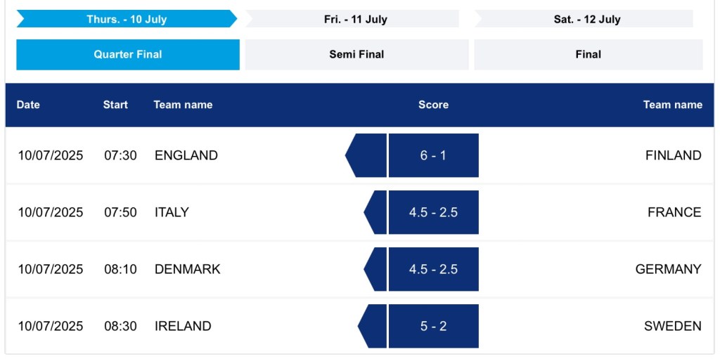ITALY (4) and DENMARK (3) both earned 4.5-2.5 wins against FRANCE (5) and GERMANY (6) in the two other Quarter Final matches to take their places in the Semi-Finals.