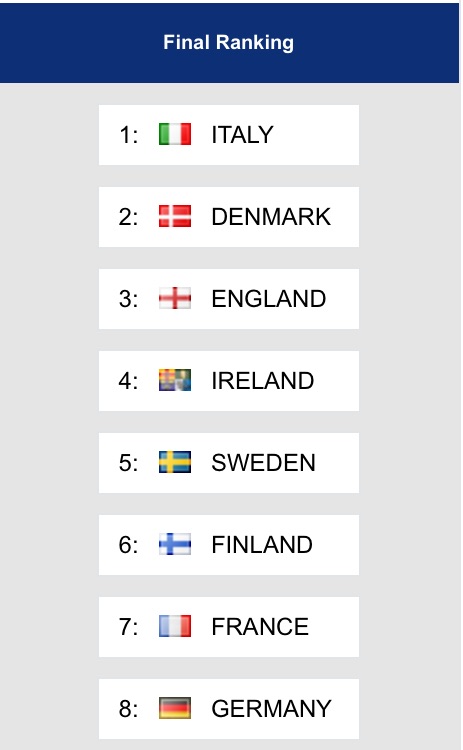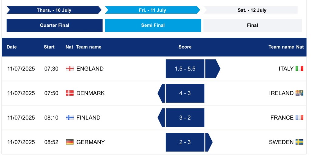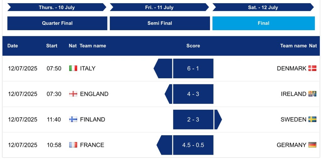 The two Semi-Finals both went against seed with ITALY (4) easily beating ENGLAND (1) and DENMARK (3) edging out IRELAND (2).