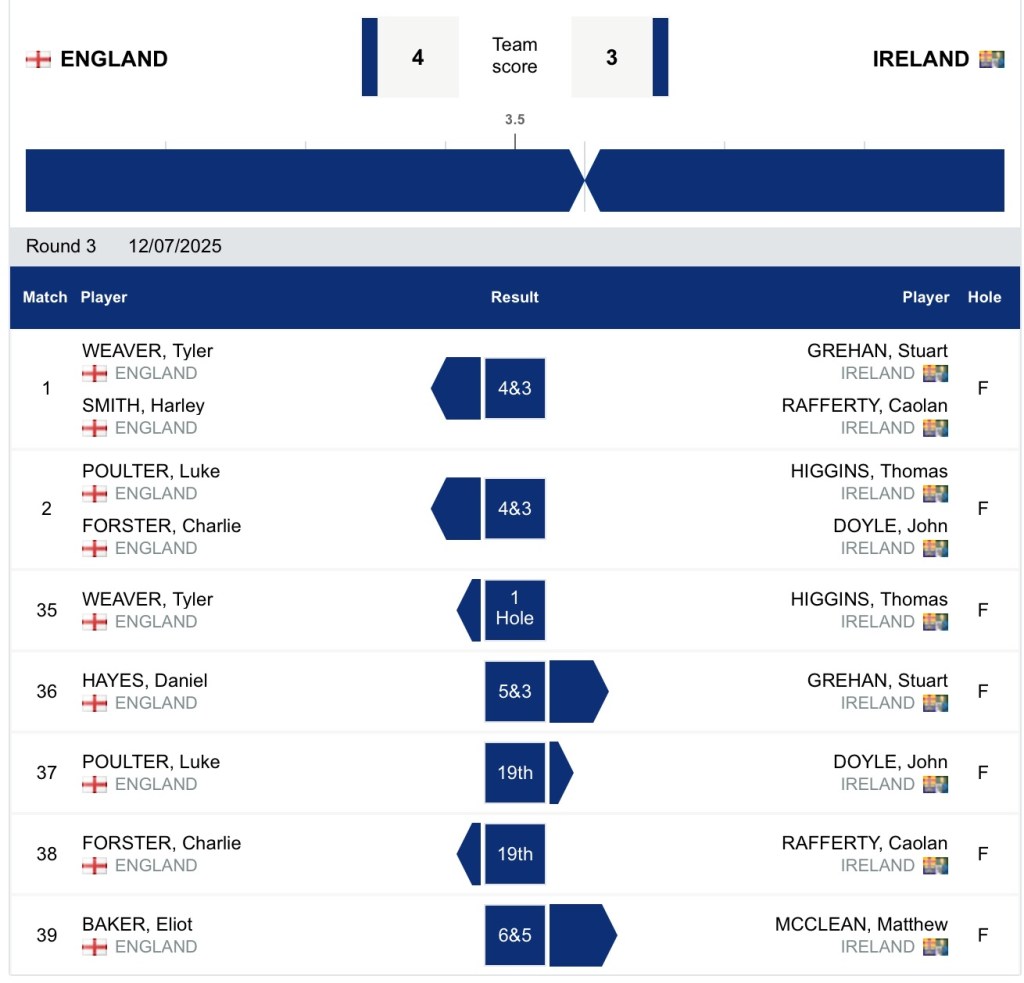 ENGLAND (1) managed to grab victory over IRELAND (2) from the jaws of defeat to take bronze. Ireland seemed to have the result in their hands when they were winning all of the afternoon Singles but late wins for Tyler WEAVER, by 1 Hole, and Charlie FORSTER, on the 19th, finally saw them over the line.