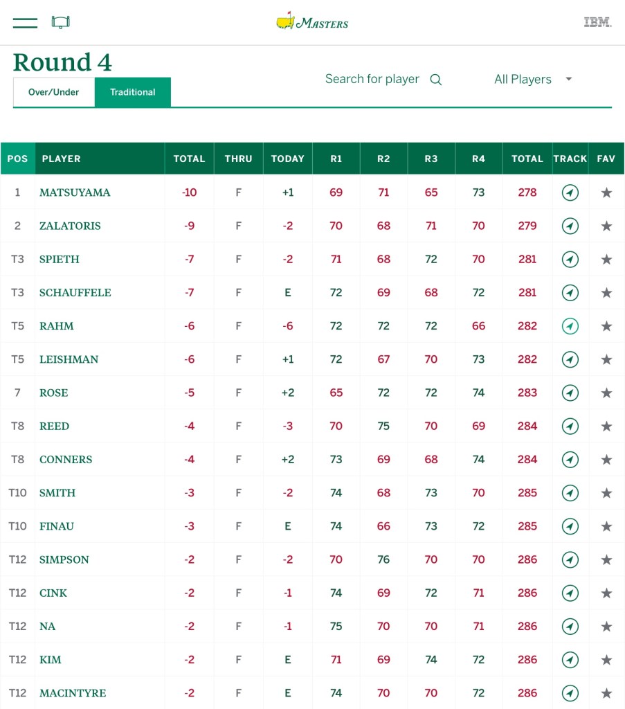 Neal Shipley’s 72 Hole Scorecard (Graphic: The Masters)