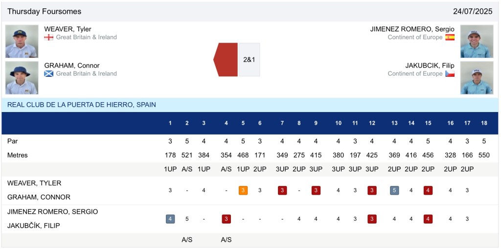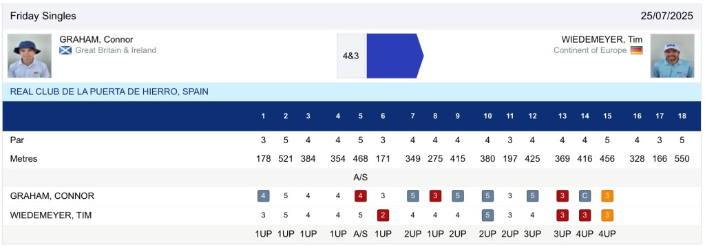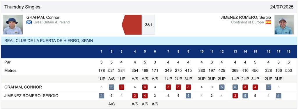 Connor GRAHAM (SCO) proved to be too good for Spain’s Sergio JIMENEZ ROMERO in Game 3. The Texas Tech rising sophomore strung five birdies together on the front nine to take control of this encounter and despite a few hiccups coming home secured a solid 3&1 win.