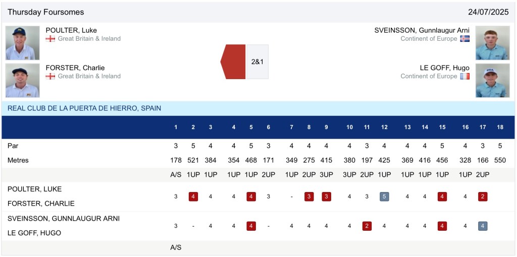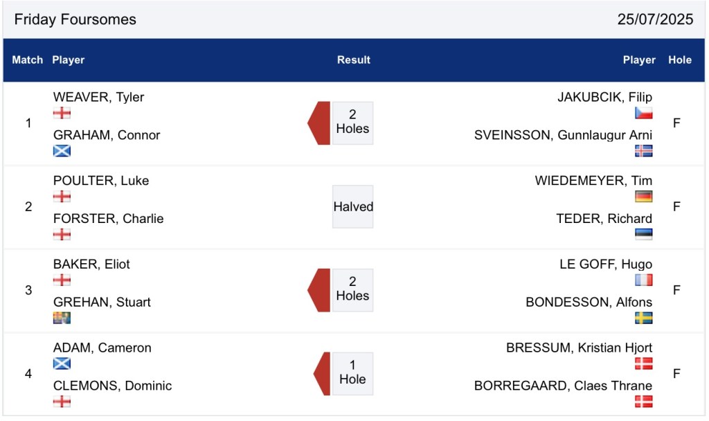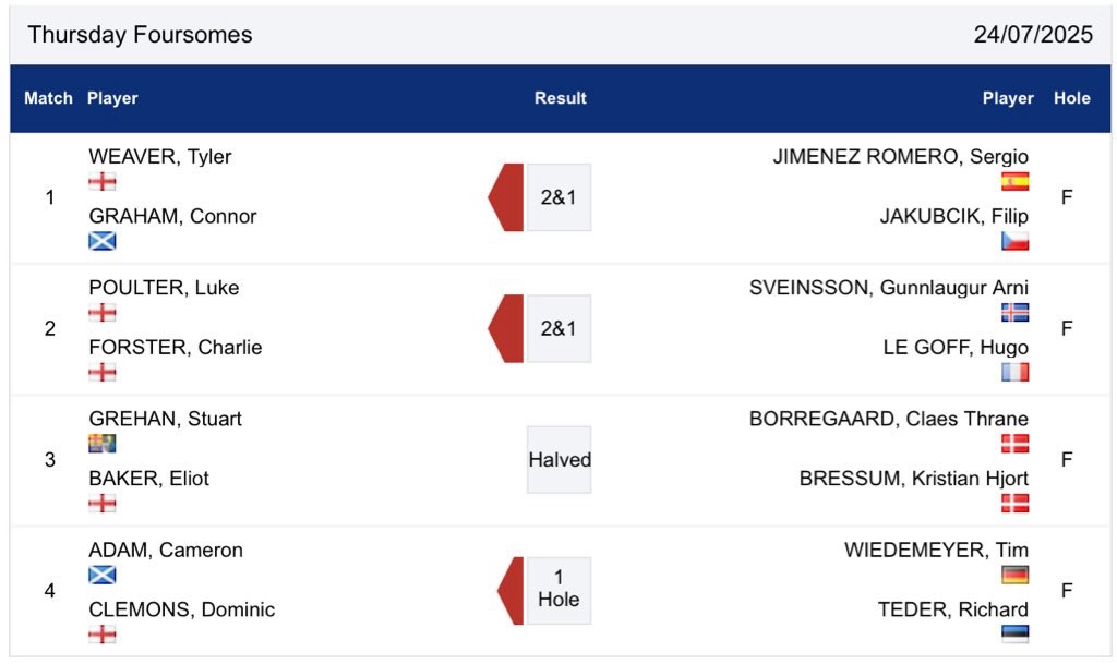 Luke POULTER (ENG) & Charlie FORSTER (ENG) delivered six birdies on route to a 2&1 victory against Gunnlaugur Arni SVEINSSON (ISL) & Hugo LE GOFF (FRA) who did little wrong in a competitive encounter.