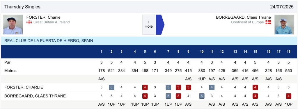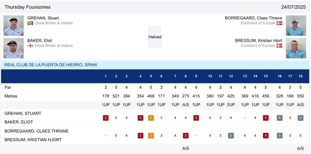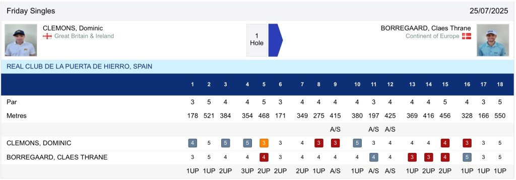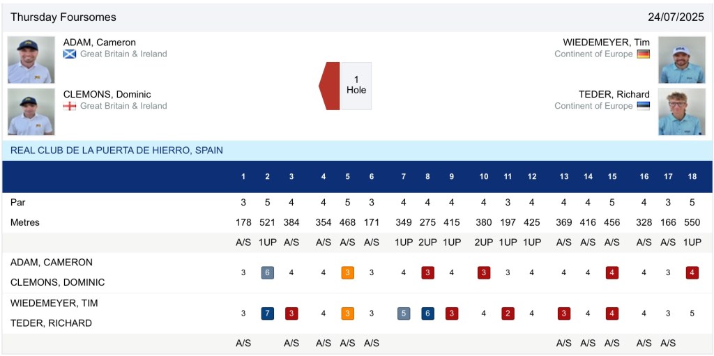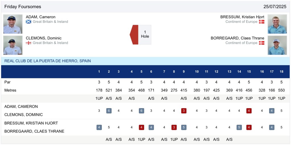 Cameron ADAM (SCO) & Dominic CLEMONS (ENG) beat the out of sorts Danish pairing of Kristian HJORT BRESSUM & Claes THRANE BORREGAARD in the final morning game. Whilst Adam & Clemons were unable to match the closing birdie that the three GB&I pairings all achieved ahead of them they had already done enough to earn the final Foursomes point.