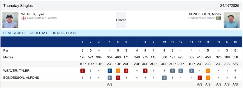 Tyler WEAVER (ENG), who was 4Up with eight holes to play, will be disappointed not to have brought home a full point for GB&I in his game against debutant Alfons BONDESSON (SWE). To his credit Bondesson fought back well and was able to to take advantage of some poor play on the back nine from the Englishman.