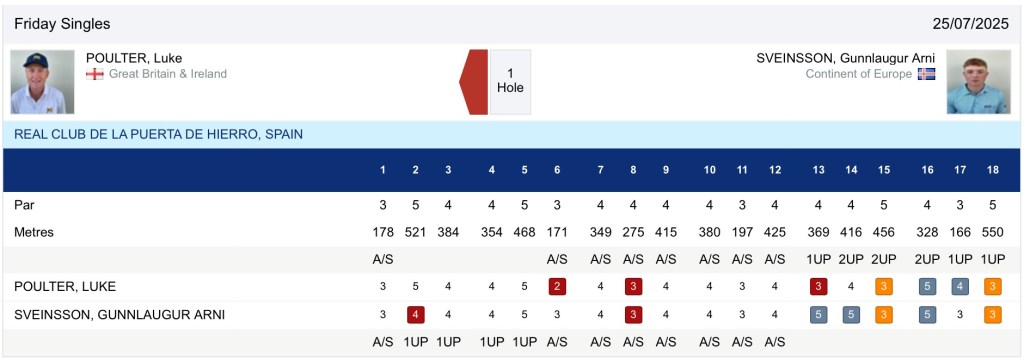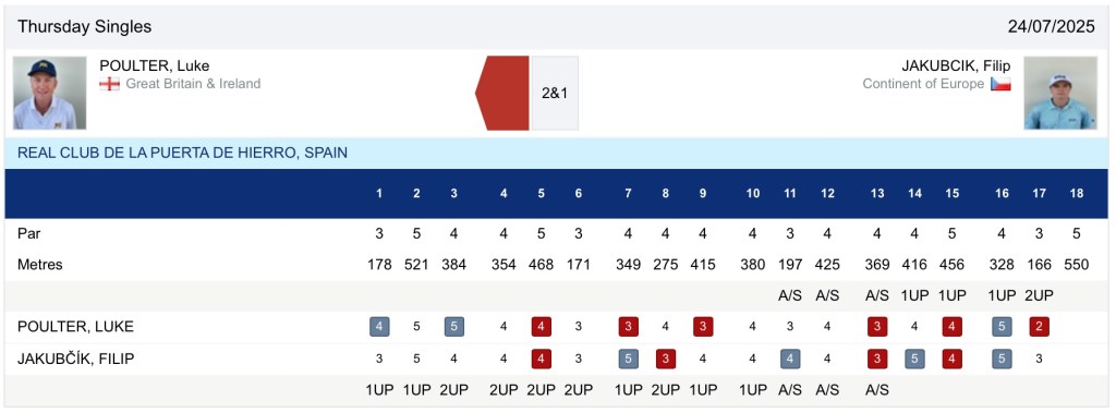 After a slow start Luke POULTER (ENG) produced six birdies to overcome European Amateur champion Filip JAKUBČÍK (CZH) who had an up-and-down day in Madrid. This was Poulter’s second point of the day and the Florida Gator is certainly making a positive impression.