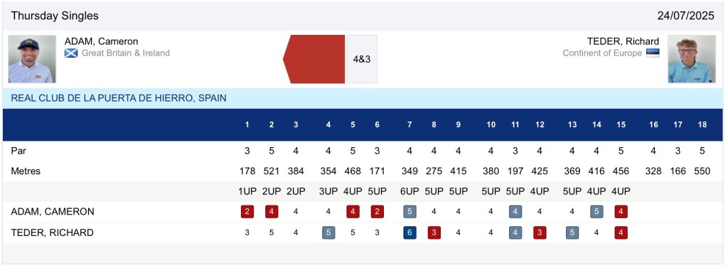 Cameron ADAM (SCO) enjoyed a fast start to his match against Richard TEDER (EST) with four birdies in their opening six holes. Playing with confidence after his great summer the Northwestern man secured a comfortable 4&3 win.