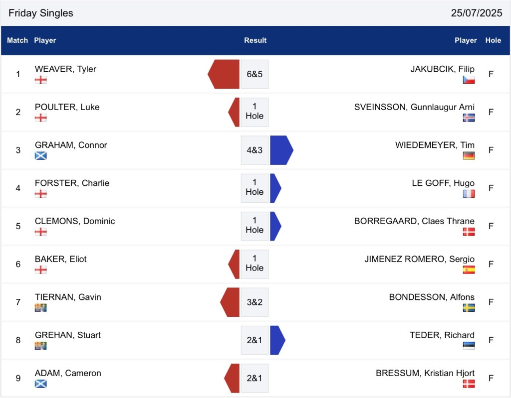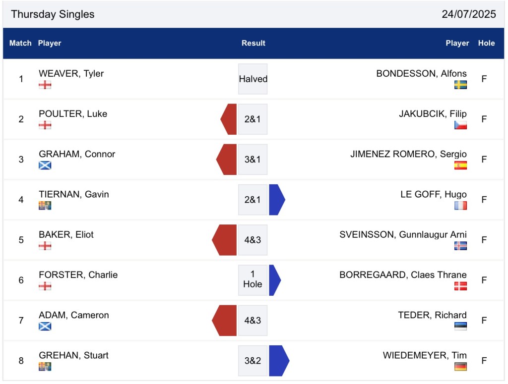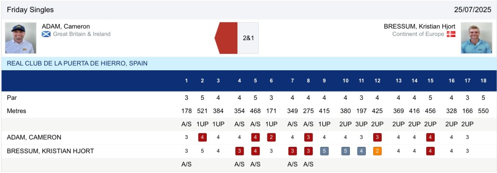 Cameron ADAM (SCO) completed a four-out-of-four win record for GB&I with an error free performance against Kristian HJORT BRESSUM (DEN) who will be rueing his play around the turn where he essentially handed the win to the in-form Scotsman.