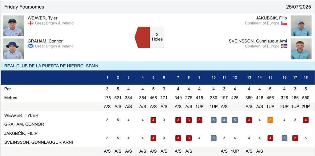 Tyler WEAVER (ENG) & Connor GRAHAM (SCO) finally overcame Gunnlauger Arni SVEINSSON (ISL) & Filip JAKUBČÍK (CZH) on the 18th hole in what was generally a high class match with plenty of birdies.