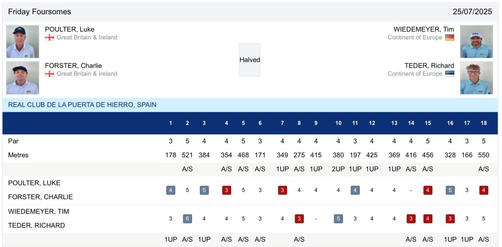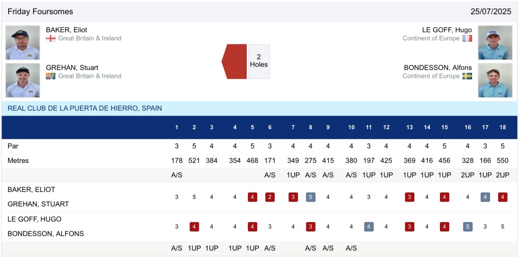 Play started at 8.30am CEST (7.30am BST) at Real Club de la Puerta de Hierro with Gavin TIERNAN (IRL) and Alfons BONDESSON (ESP) left out of the Foursomes line-ups by the two captains, Dean Robertson and Carlos de Corral.