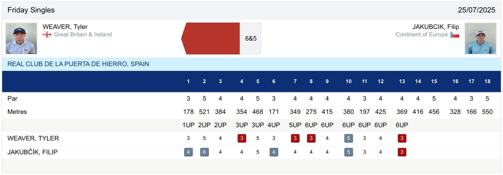 Tyler WEAVER (ENG) maintained his unbeaten record in this year’s match with a comprehensive 6&5 victory over Filip JAKUBČÍK (CZH) who handed the initiative to Weaver early on and was simply not in the form to ever recover it.