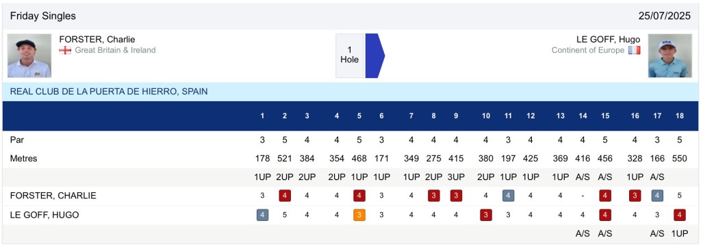 Hugo LE GOFF (FRA), who had trailed for most of the round, chose the optimum time to take the lead – the 18th green – as he robbed Charlie FORSTER (ENG) of a first singles win.
