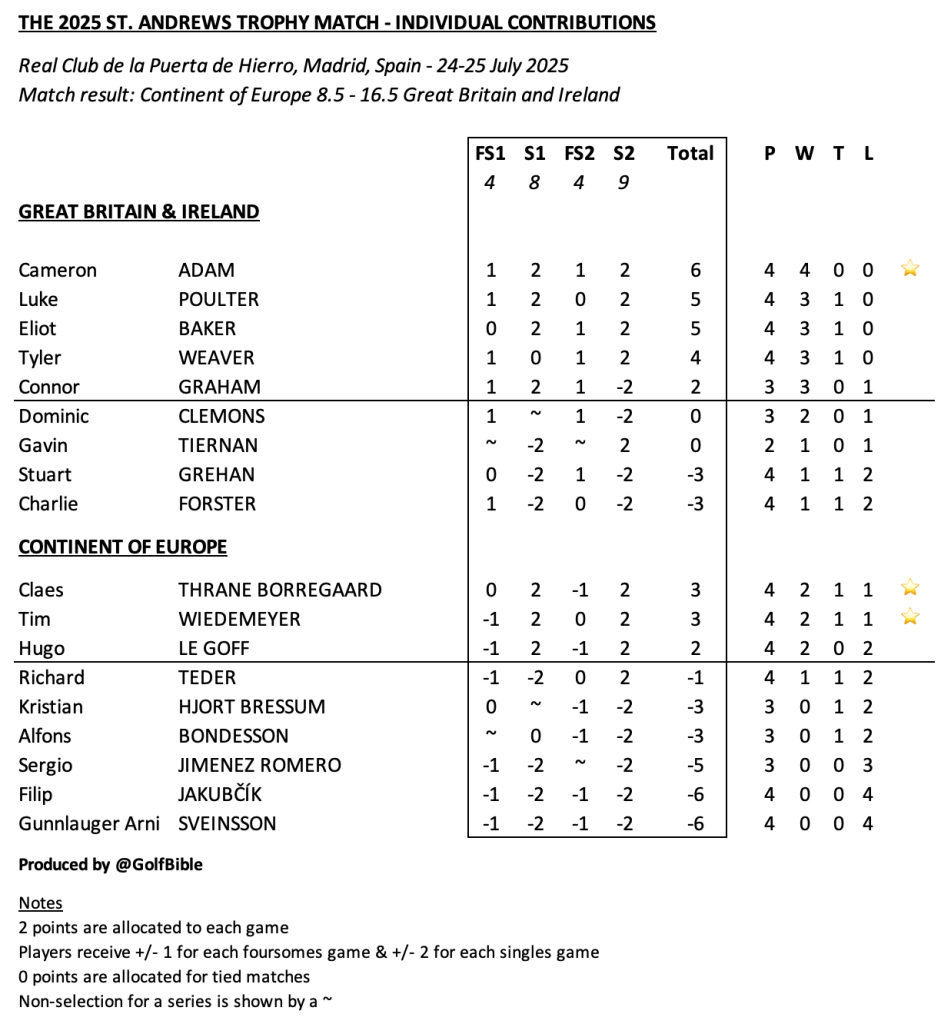 Great Britain & Ireland (GB&I) won The 35th St. Andrews Trophy match against Continent of Europe by 16.5-8.5 points at Real Club de la Puerta de Hierro in Madrid, Spain.