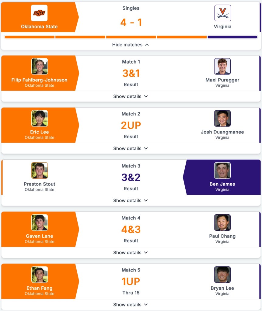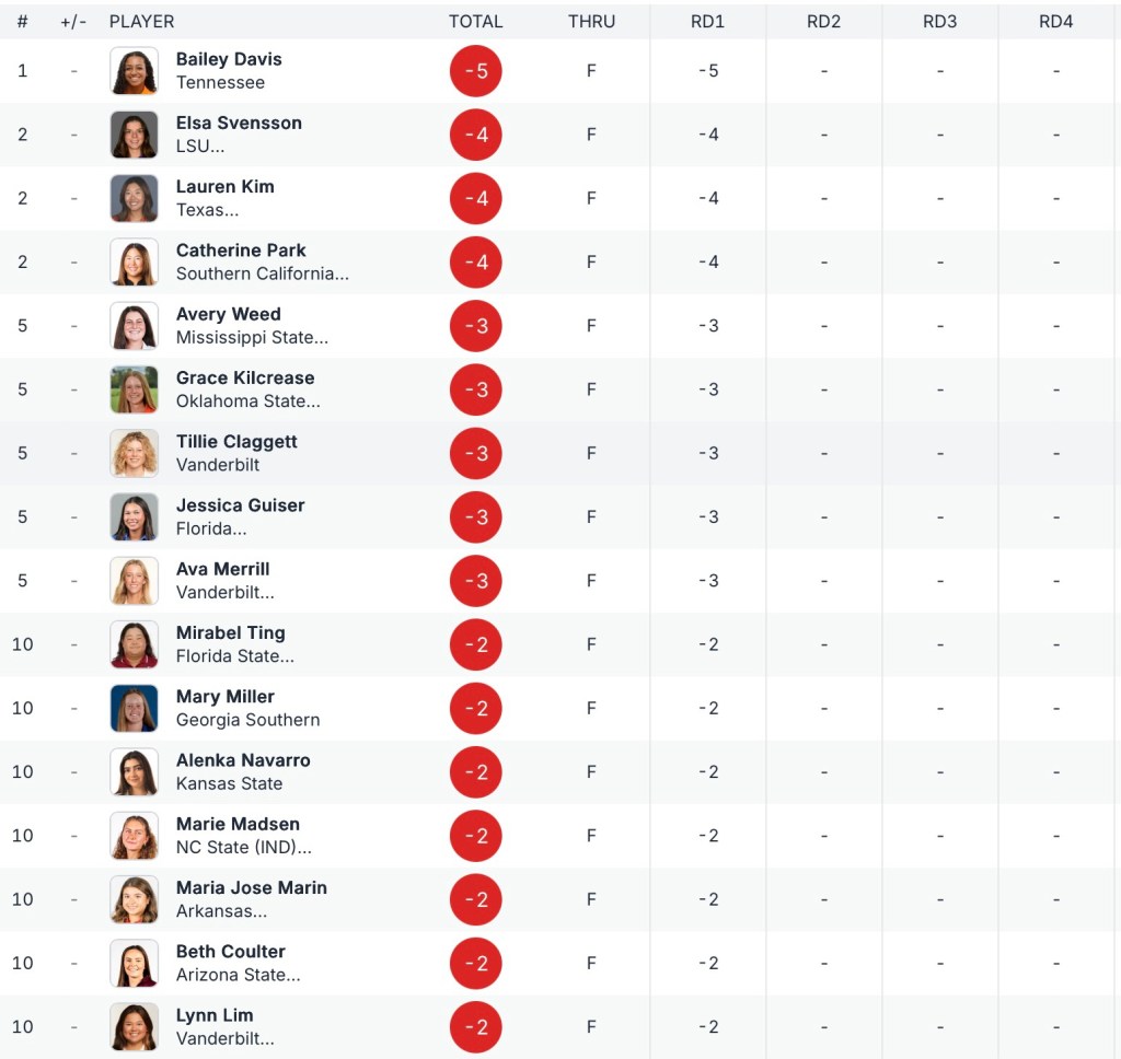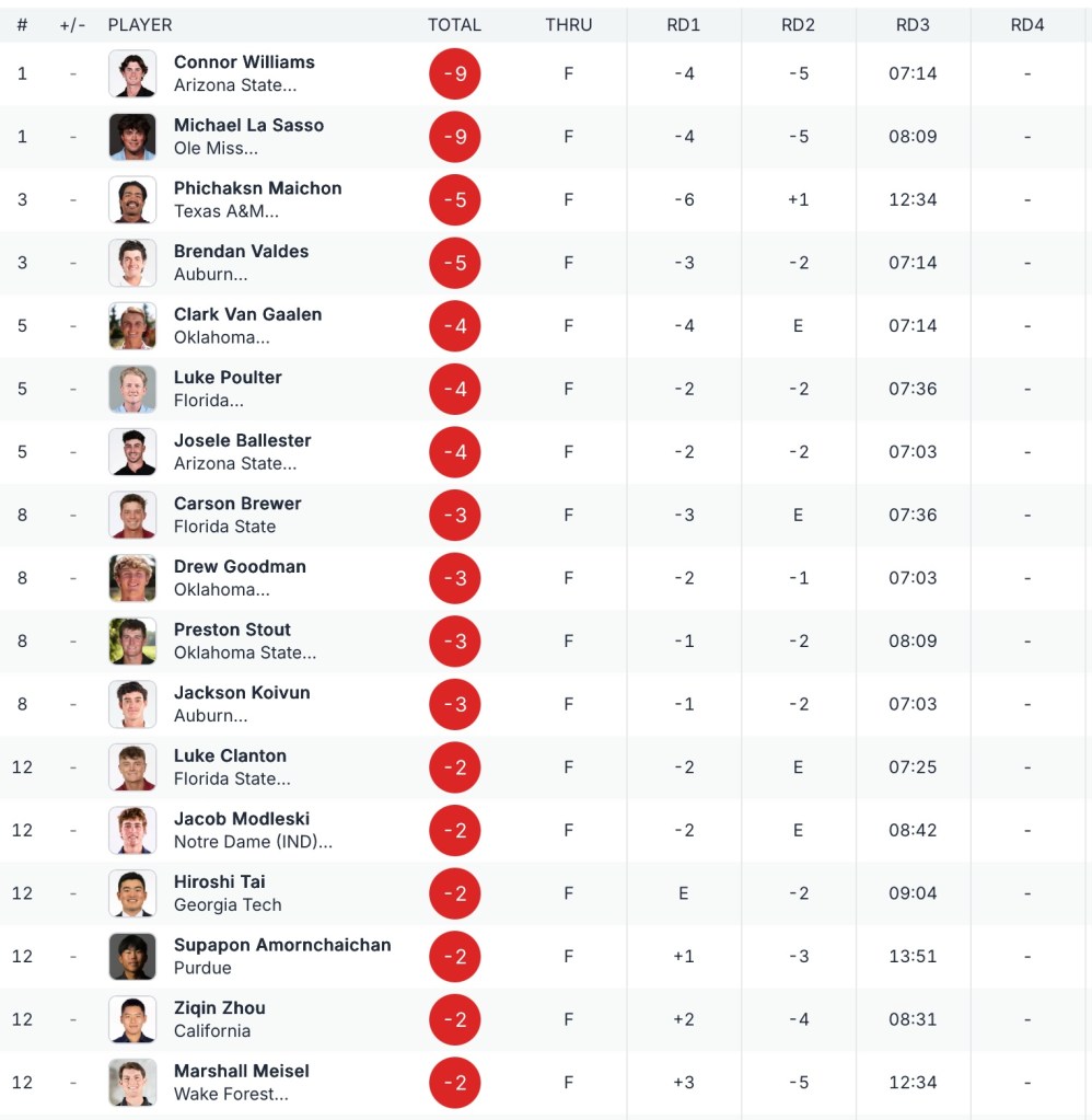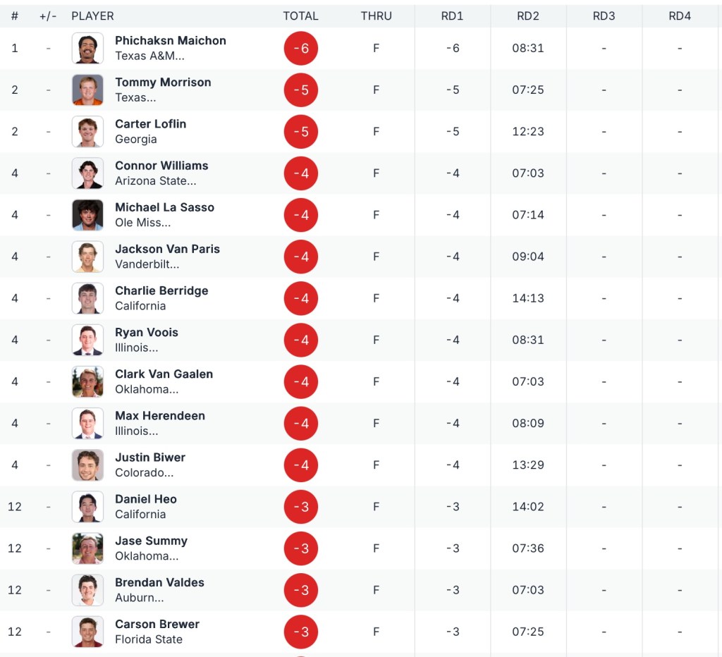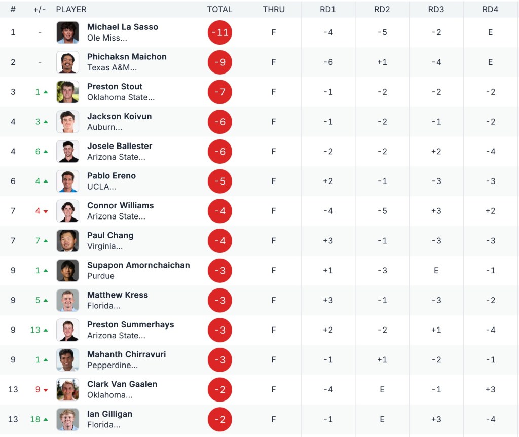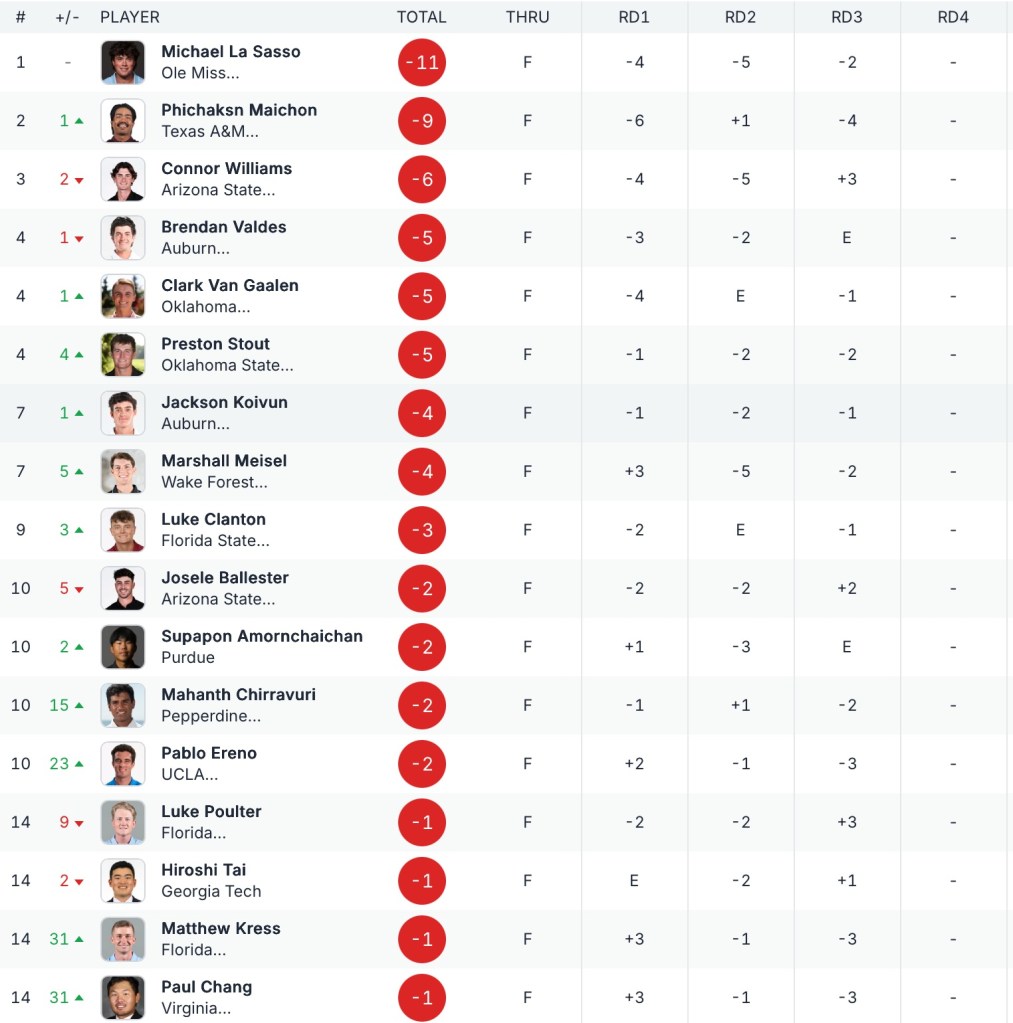 Michael LA SASSO (USA / Ole Miss.) -11 leads Phichaksn MAICHON (THA / Texas A&M) -9, Connor WILLIAMS (USA / Arizona State) -6 and Brendan VALDES (USA / Auburn), Clark VAN GAALEN (USA / Oklahoma) & Preston STOUT (USA / Oklahoma State) -5 in the Individual standings.