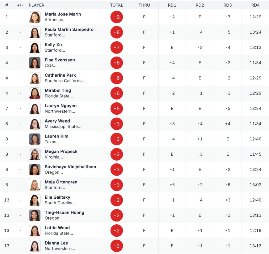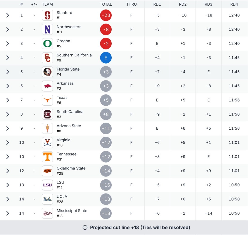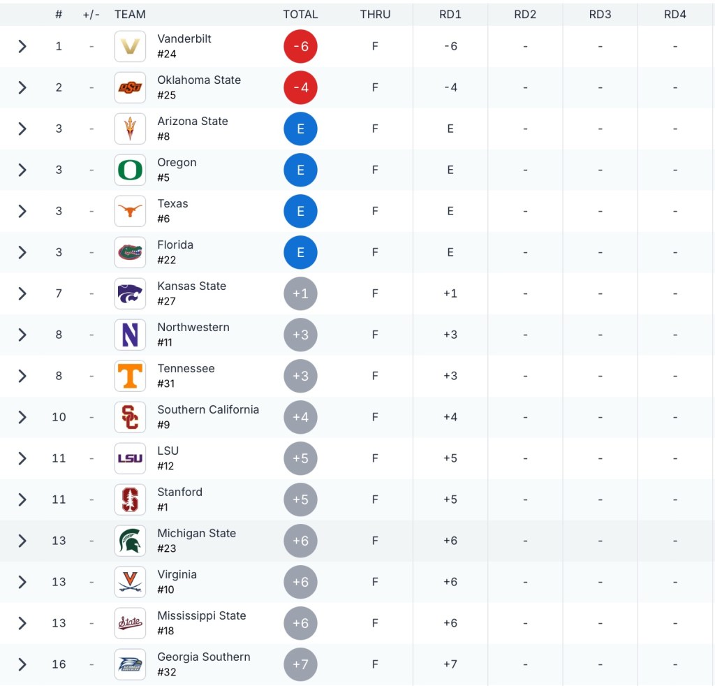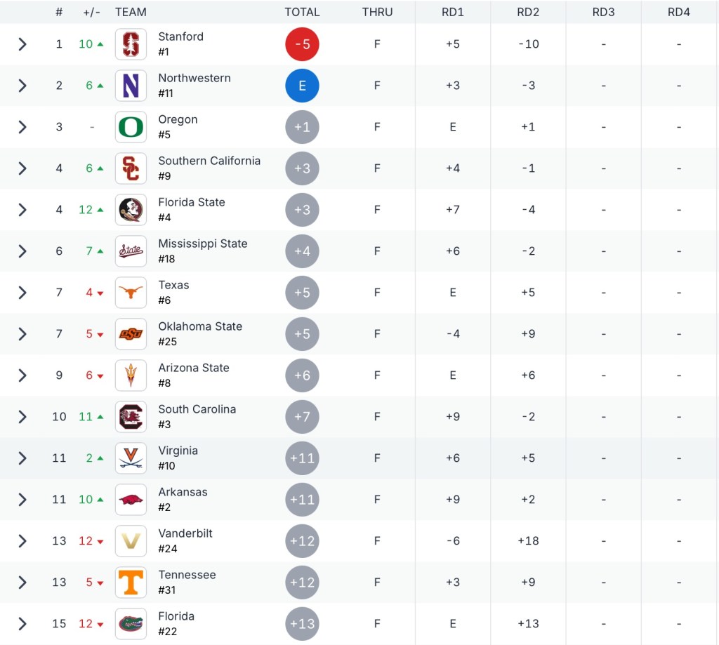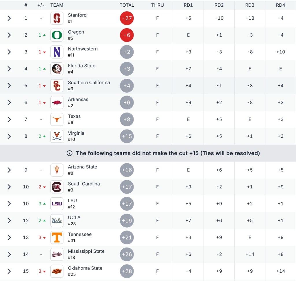 Stanford (+9) also beat Oregon (+12) in the stroke play stage of the competition with Texas A&M (+14) finishing 3rd.