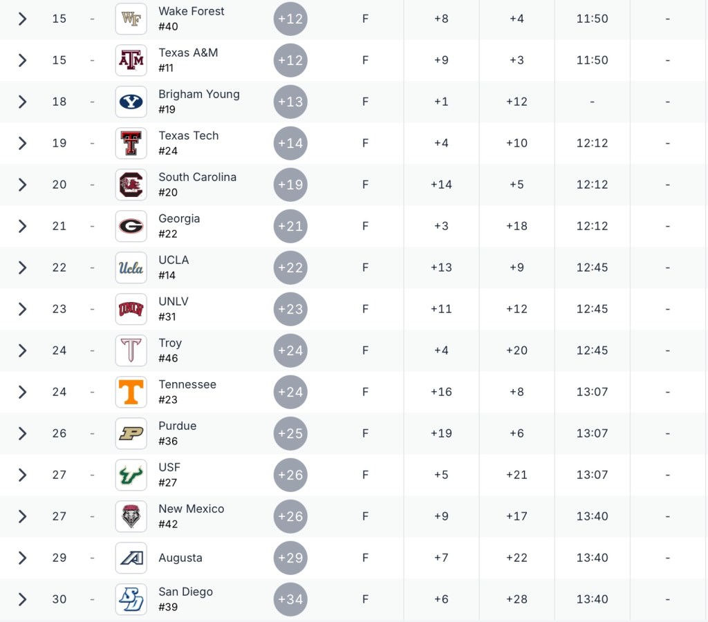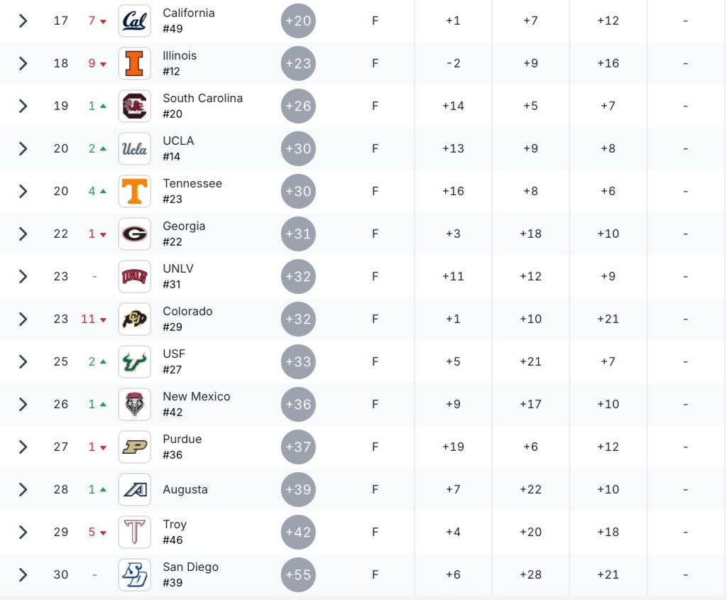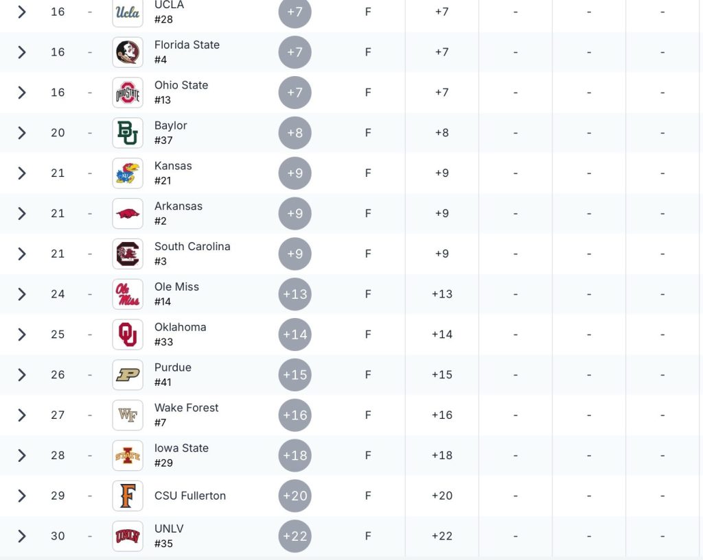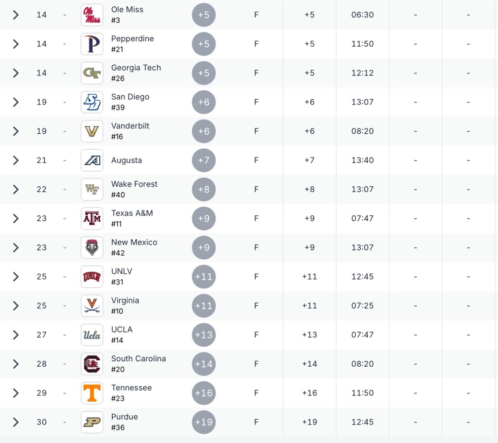 OKLAHOMA STATE (-8) are 2nd and GEORGIA & SOUTH CAROLINA (-2) Tied 3rd.