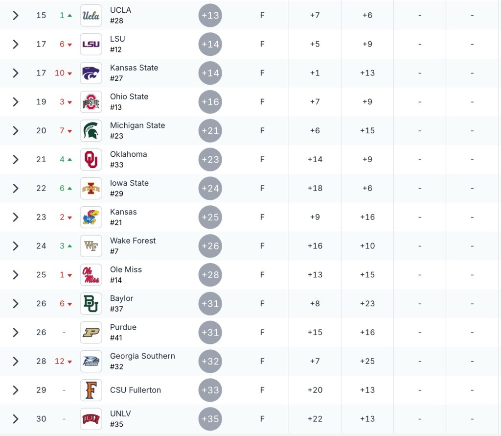 Sadly from a GB&I perspective FLORIDA STATE (+12) 9th and TEXAS TECH (+14) 10th were the two teams who narrowly missed out.
