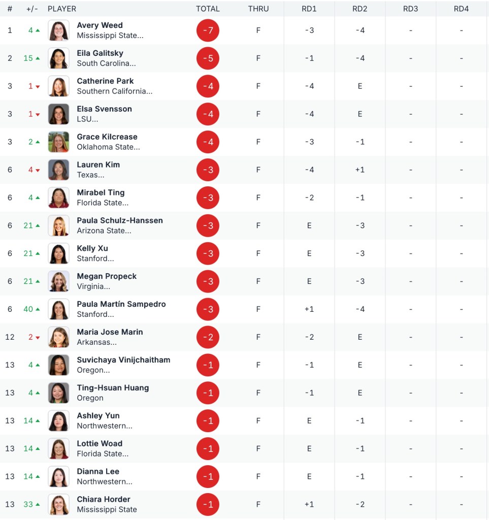 Stroke Play Round 2 Leading Individual Scores (Graphic: Scoreboard / NCAA)