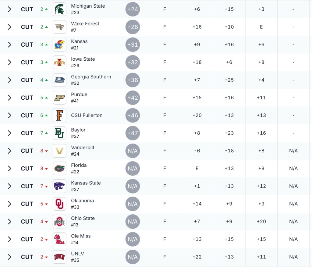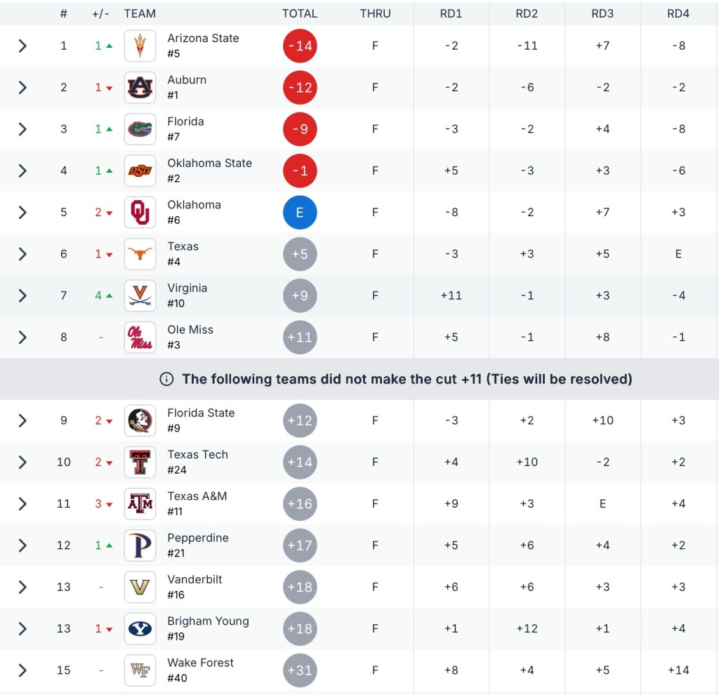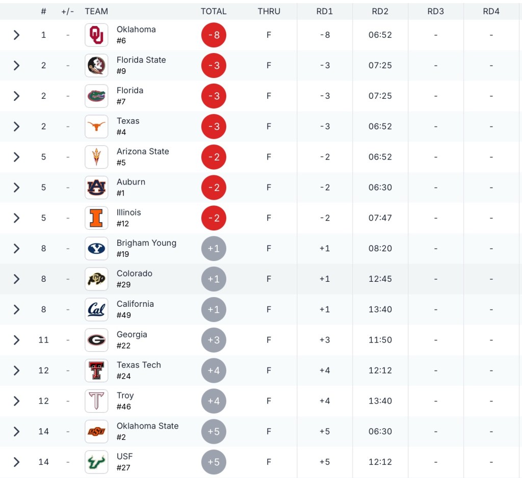 FLORIDA (-1) will start Day 4 in 4th place with OKLAHOMA STATE (+5) in 5th.