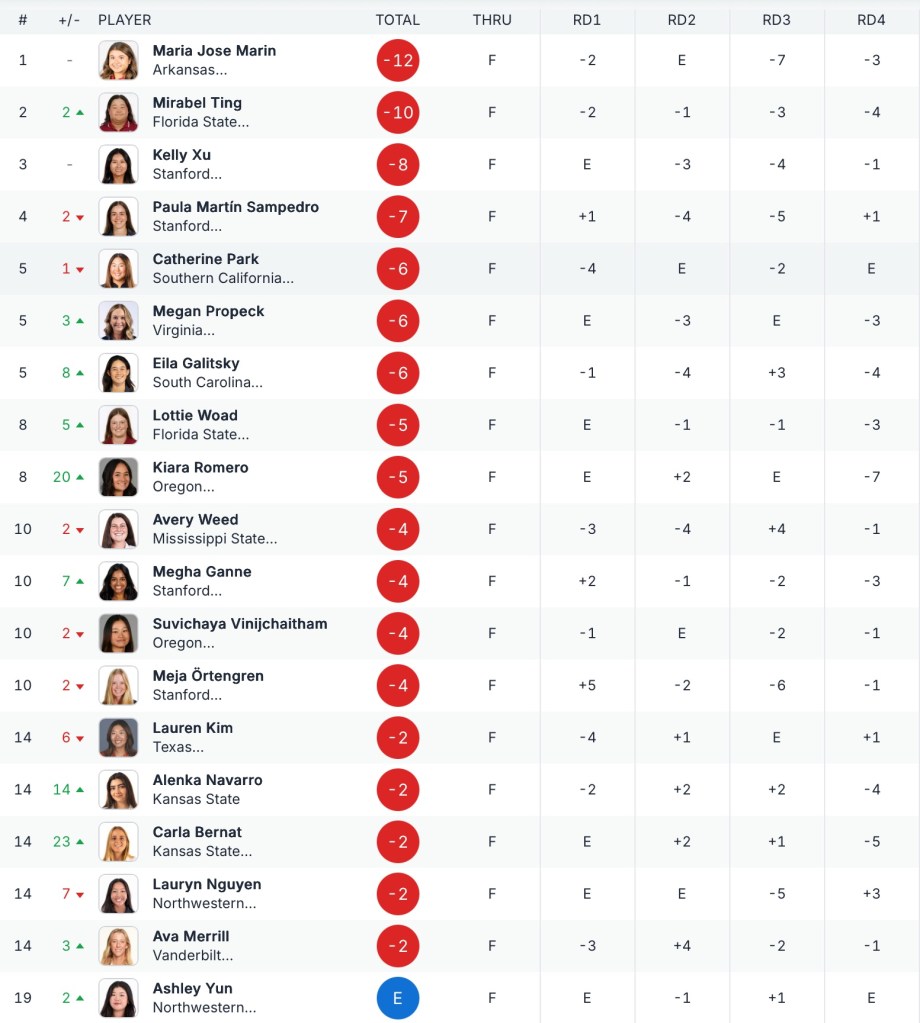With rounds of 68, 70, 69 and 75 (-6) Rose ZHANG of Stanford University won the NCAA Division I Women’s Individual Championship. She finished 3 shots ahead of Natasha Andrea OON who was representing San Jose State with Jennie PARK (Texas A&M) and Ingrid LINDBLAD (LSU) both two shots further back.