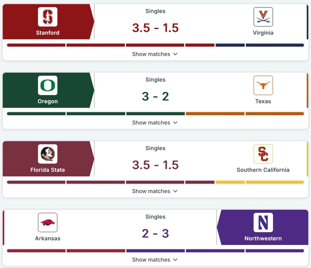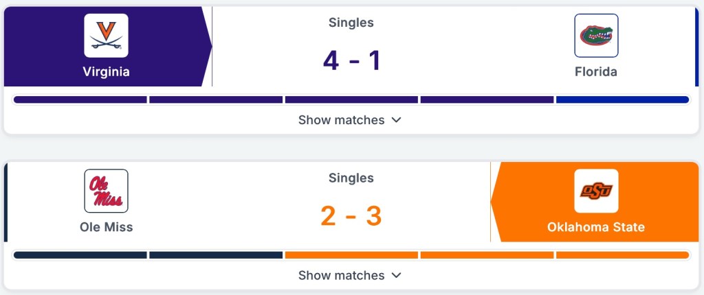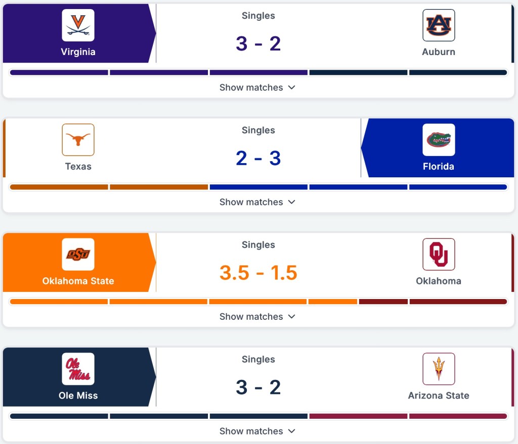 The Quarter Finals of the NCAA Division I Men’s National Championship were won by VIRGINIA (7), FLORIDA (3), OKLAHOMA STATE (4) and OLE MISS. (8).
