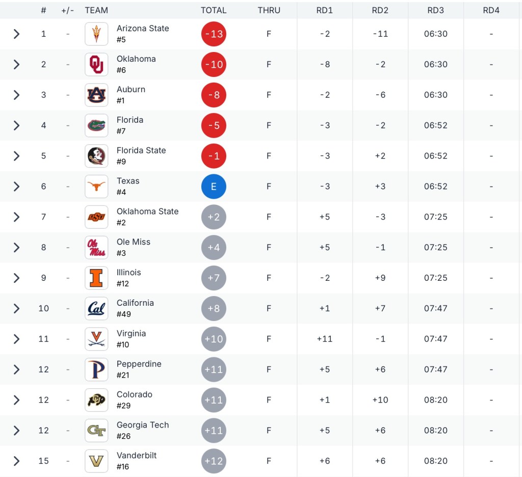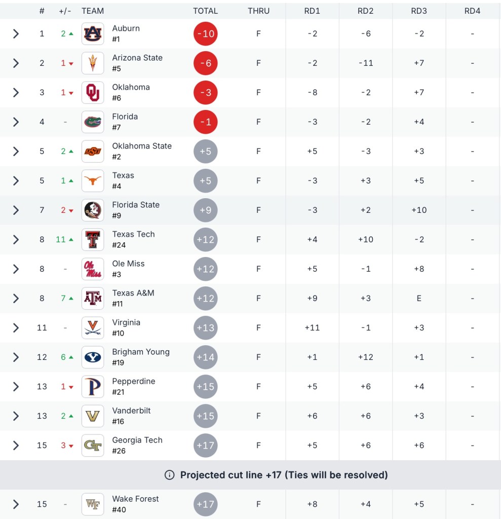 ARIZONA STATE (-6) and OKLAHOMA (-3) both dropped a place in the standings after they could only manage a +7 team score in Round 3.
