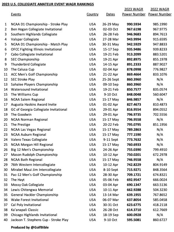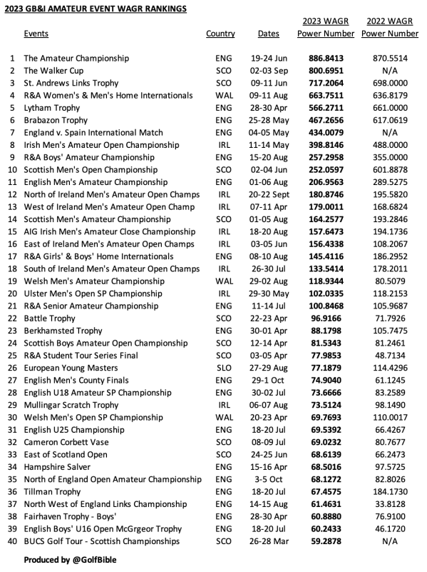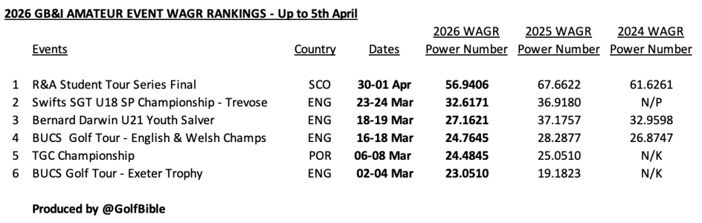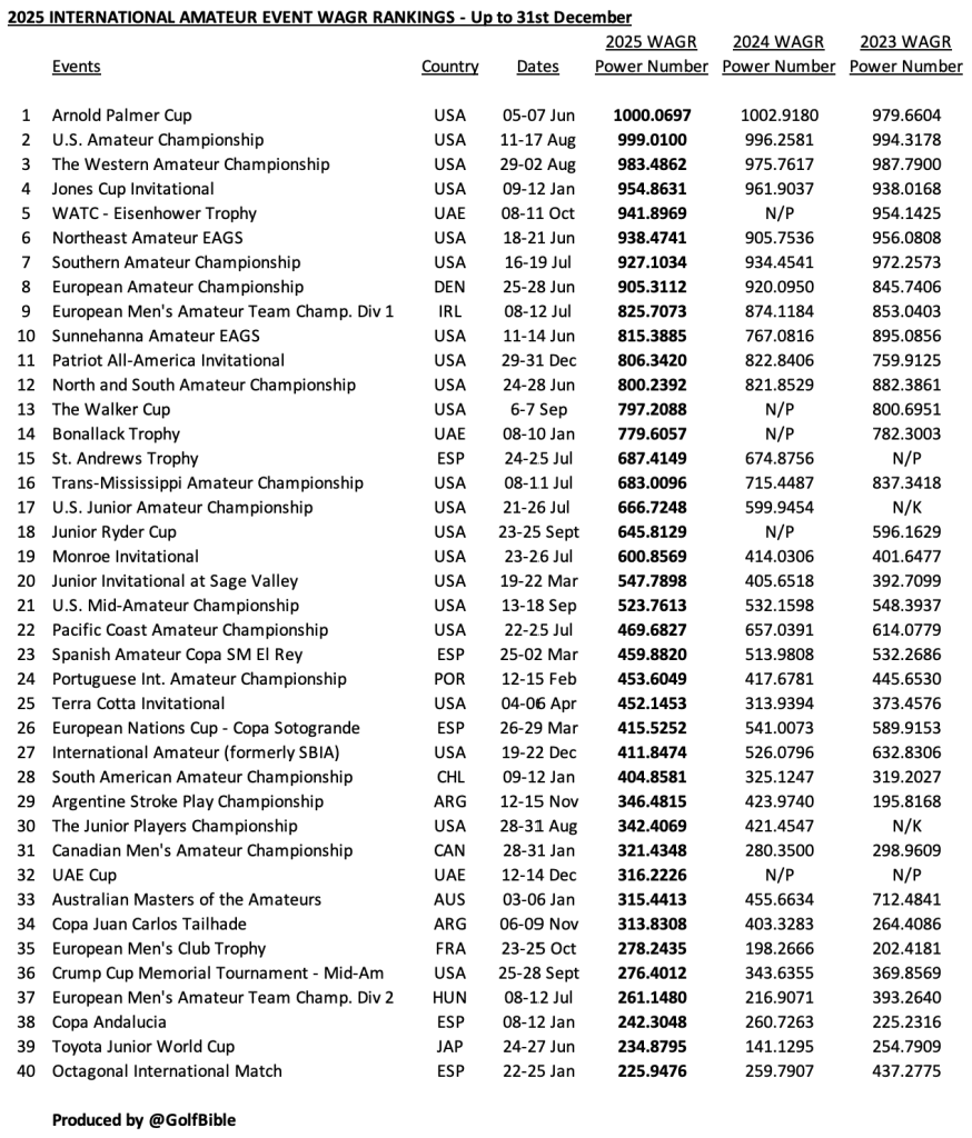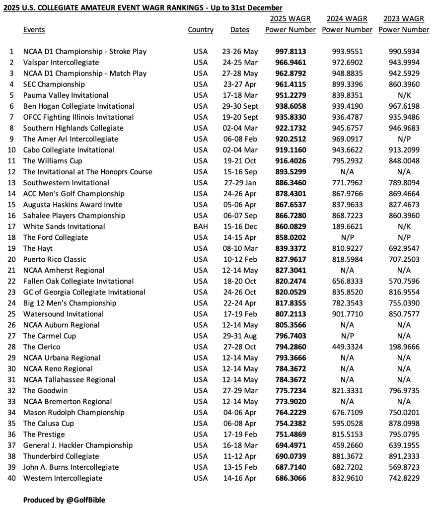 Here are the 2020-2025 WAGR event rankings based on its allocated ‘power numbers’. There is one each for U.S. Collegiate, International and GB&I events. Each list is restricted to events that have featured GB&I players.