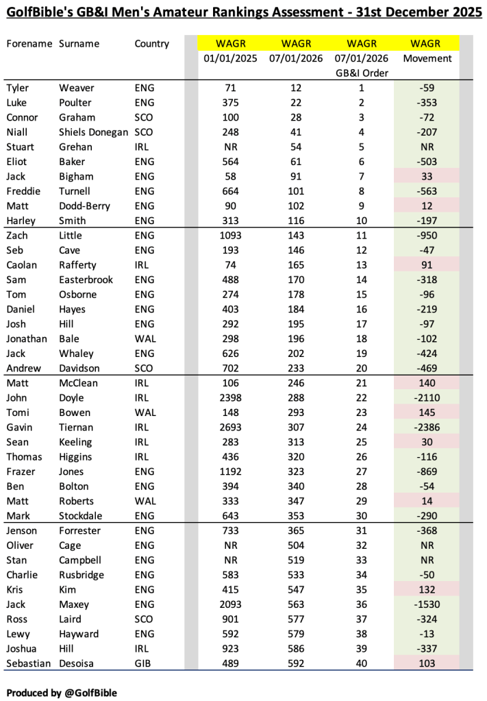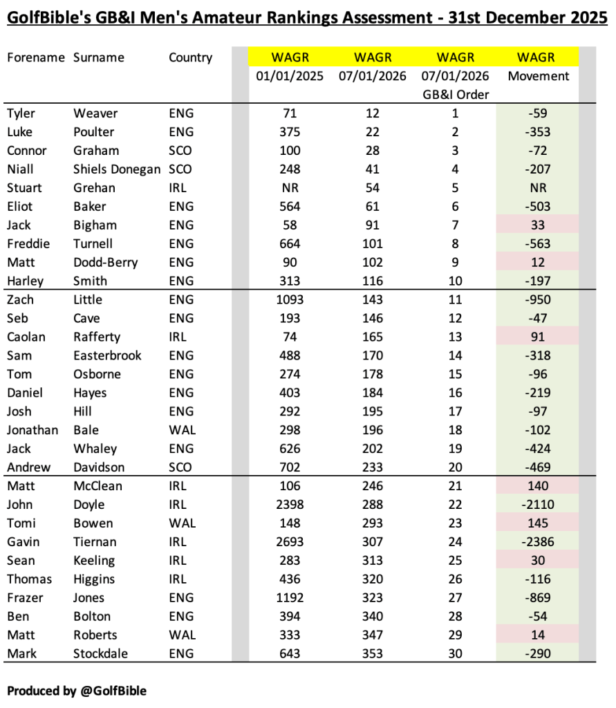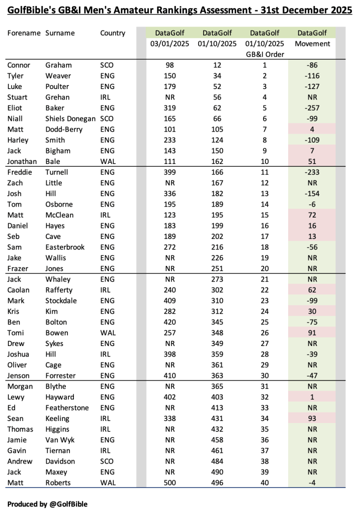 Here is my analysis of the Great British & Irish (GB&I) men’s amateur golf rankings as at 31st December 2025 (Quarter 4 / Year End – 2025).