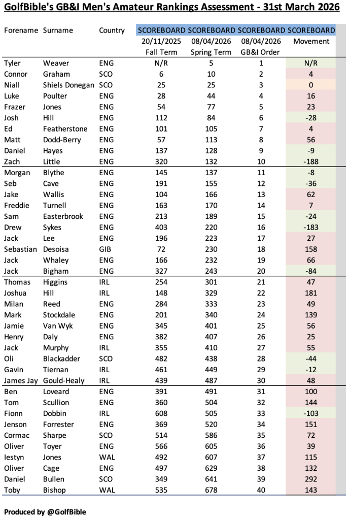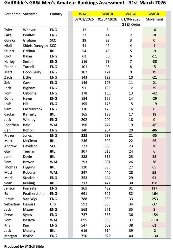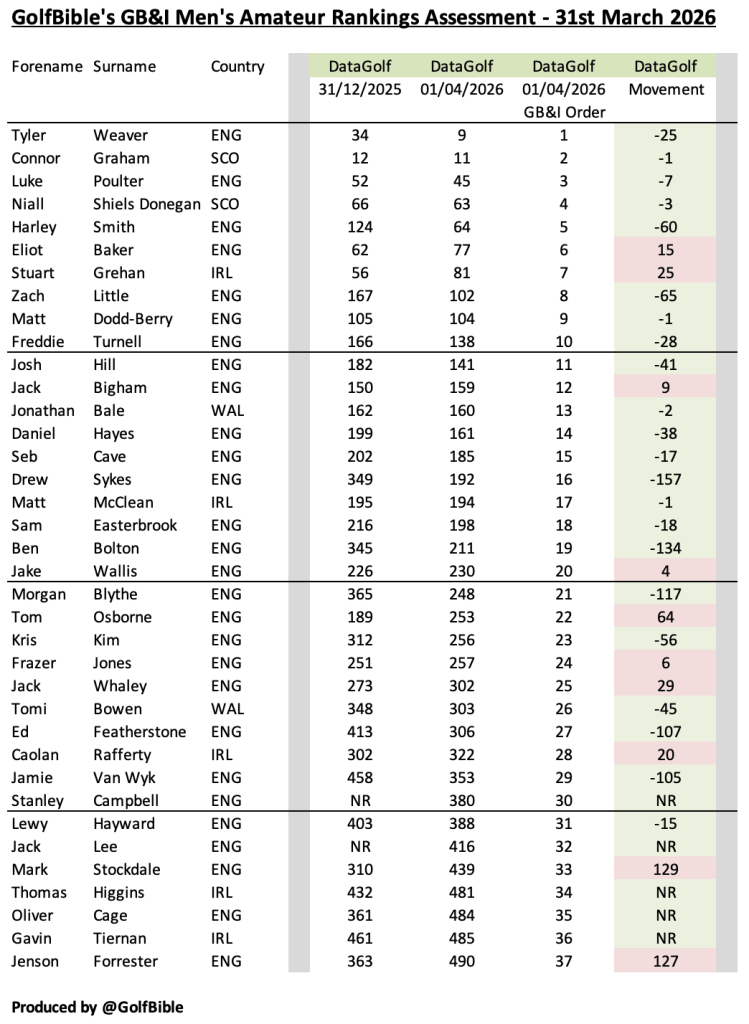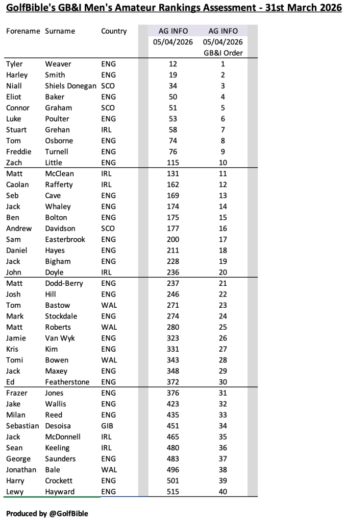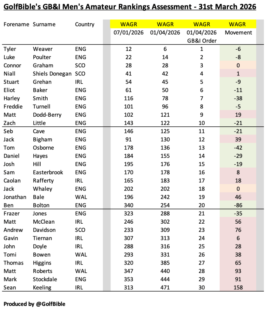Here is my analysis of the Great British & Irish (GB&I) men’s amateur golf rankings as at 31st March 2026 (Quarter 1 – 2026).