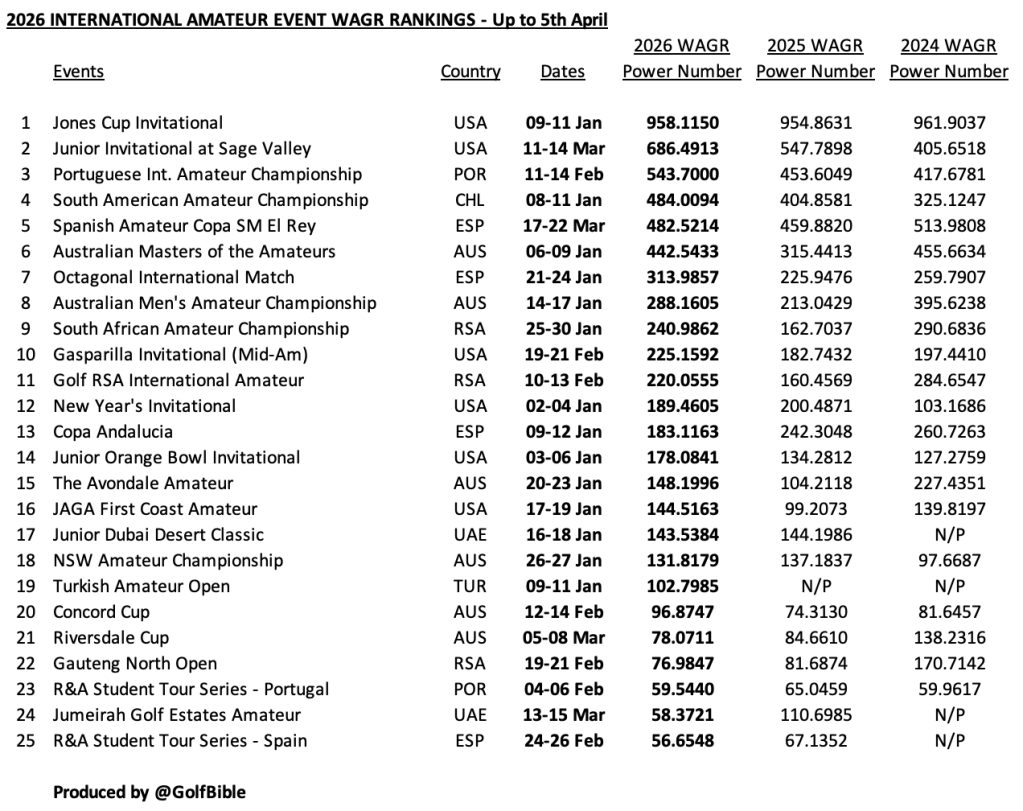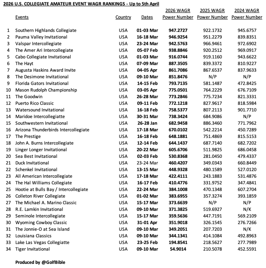 I have used its event ‘power numbers’ (PN) to create three 2026 Year To Date WAGR event rankings – U.S. Collegiate (Min. PN 200.0000), International (Min. PN 50.0000) and GB&I (Min. PN 20.0000).