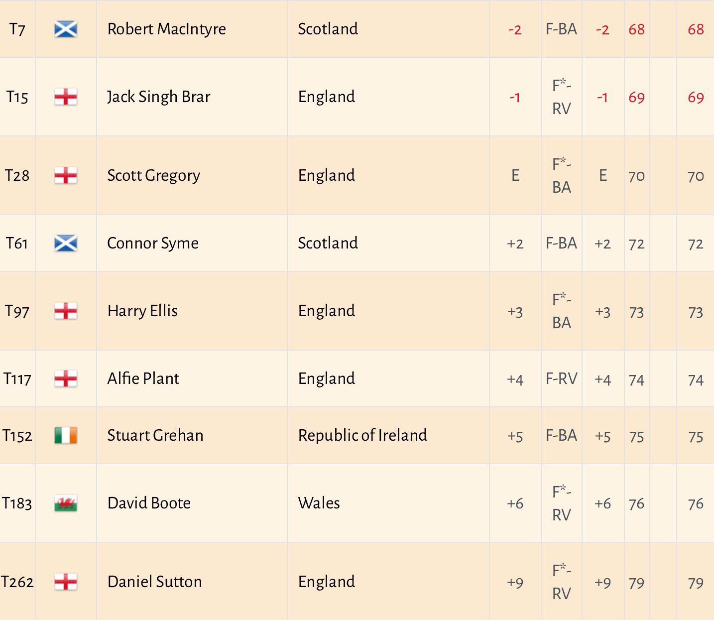 Amongst the leading players to miss out were Joe PAGDIN (ENG) +7, Dylan PERRY (AUS) +7, Andrew WILSON (ENG) +7, Calum FYFE (SCO) +8, Euan WALKER (SCO) +8, John AXELSON (DEN) +8, Angel HIDALGO (ESP) +8, Christo LAMPRECHT (RSA) +8, Clayton MANSFIELD (RSA) +9, Gian-Marco PETROZZI (ENG) +9, Sam LOCKE (SCO) +9, Nick POPPLETON (ENG) +9, Alex GLEESON (IRE) +10, Alex FITZPATRICK (ENG) +10, Jake BURNAGE (ENG) +11, Caolan RAFFERTY (IRE) +13, Bailey GILL (ENG) +14, Jamie STEWART (SCO) +16, Garrick HIGGO (RSA) +17, Todd CLEMENTS (ENG) +17 and John PAK (USA) +18.