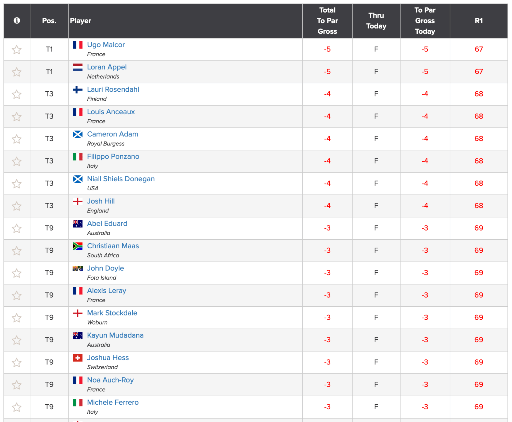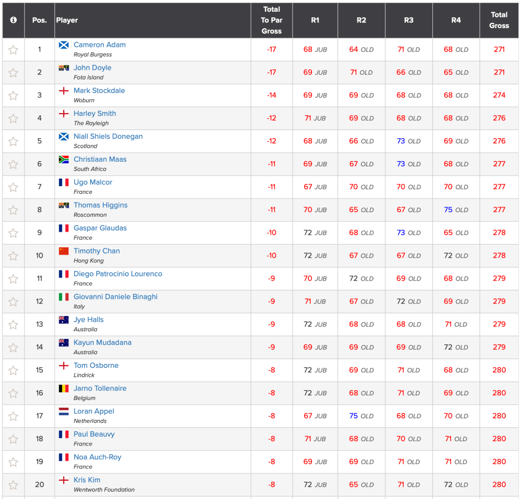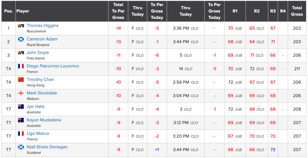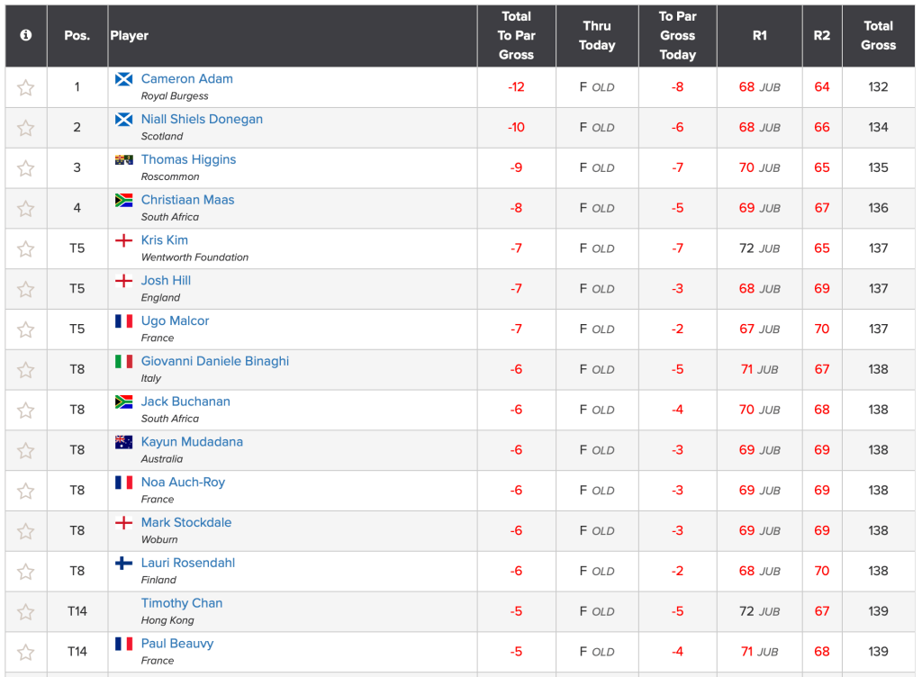 The best GB&I performances came from Calum SCOTT (SCO) and James ASHFIELD (WAL). They both advanced from Stroke Play Qualifying before losing in the Match Play Round of 32 (2nd Round). Scott to Omar MORALES (MEX) by 3&2 and Ashfield to Phichaksn MAICHON (THA) by 4&2.